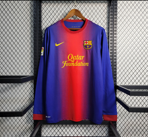 The FC Barcelona 2012-2013 home shirt featured a unique gradient design between the blue and red colors, departing from the club's traditional solid stripes. The shirt predominantly showcased the iconic blue and red colors, with a smooth transition between the two. It included the Barcelona club badge and the logo of the club's sponsor at that time. The shirt was likely produced by a renowned sportswear brand like Nike or Adidas.