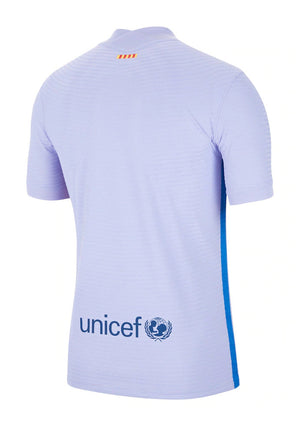 The Barcelona 21/22 Away Shirt is the official away jersey of FC Barcelona for the 2021-2022 season. It features a vibrant teal color, representing a modern and fresh look. Made with high-quality materials, the shirt offers comfort, breathability, and durability. The Barcelona crest is proudly displayed on the front, while the Nike logo is positioned on the right chest. The unique geometric pattern adds visual interest and depth to the design. The back of the shirt is solid teal, and the V-neck collar provides both style and comfort. The Barcelona 21/22 Away Shirt is a must-have for fans, allowing them to show their support during away matches.