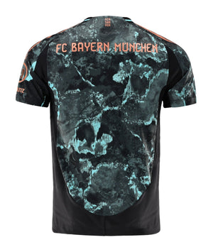 The Adidas FC Bayern München 2024-2025 away shirt is primarily black, inspired by the iconic 'Bavaria' statue, the patroness of the Bavarian state. It features a unique turquoise rust design on the crest and a rust-inspired all-over pattern. Made from high-quality materials with advanced moisture-wicking technology, the shirt offers a comfortable, athletic fit. This jersey honours Bavarian cultural heritage with a sleek, modern design.