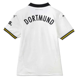 The Dortmund Third 24/25 Womens Jersey is a sleek blend of modern design and club heritage. Featuring a striking black base with vibrant yellow accents, it showcases the iconic Dortmund crest proudly on the chest. Crafted from lightweight, breathable fabric, this Womens Jersey ensures optimal comfort and performance on and off the pitch. Perfect for fans and players alike, it's a must-have for showing your support in style.