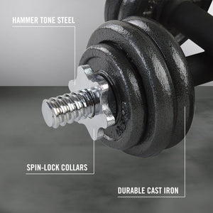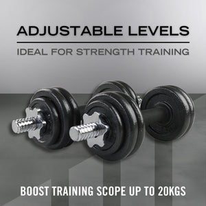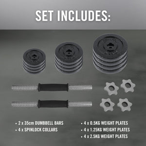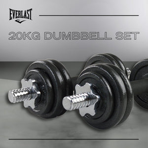The Everlast 20KG Dumbbell Set includes 2 x 35cm dumbbell bars with 4 x spinlock collars, 4 x 0.5KG, 4 x 1.25KG and 4 x 2.5KG weight plates. The total weight of the set includes the bar and collars. Made from hammer tone steel. Everlast 20KG Dumbbell Set is ideal for strength training and can be used in conjunction with any Everlast gym or bench.
