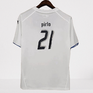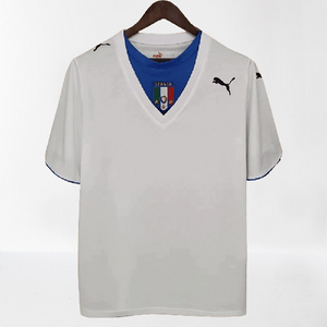 The Azzurri 06/07 Away Jersey is the official football jersey worn by the Italian national football team during the 2006-2007 season. It features a predominantly white colour with thin vertical stripes in the colours of the Italian flag: green, white, and red, running down the front. The jersey has a V-neck collar and short sleeves for a comfortable fit. The Italian national team crest is proudly displayed on the left chest, symbolizing the team's heritage and pride. The jersey is made from high-quality materials that provide breathability and durability, ensuring optimal performance on the field. The Azzurri 06/07 Away Jersey holds significance for Italian football fans, representing the team's presence in important international tournaments and their dedication to representing their country with skill and passion.