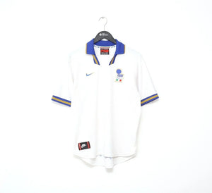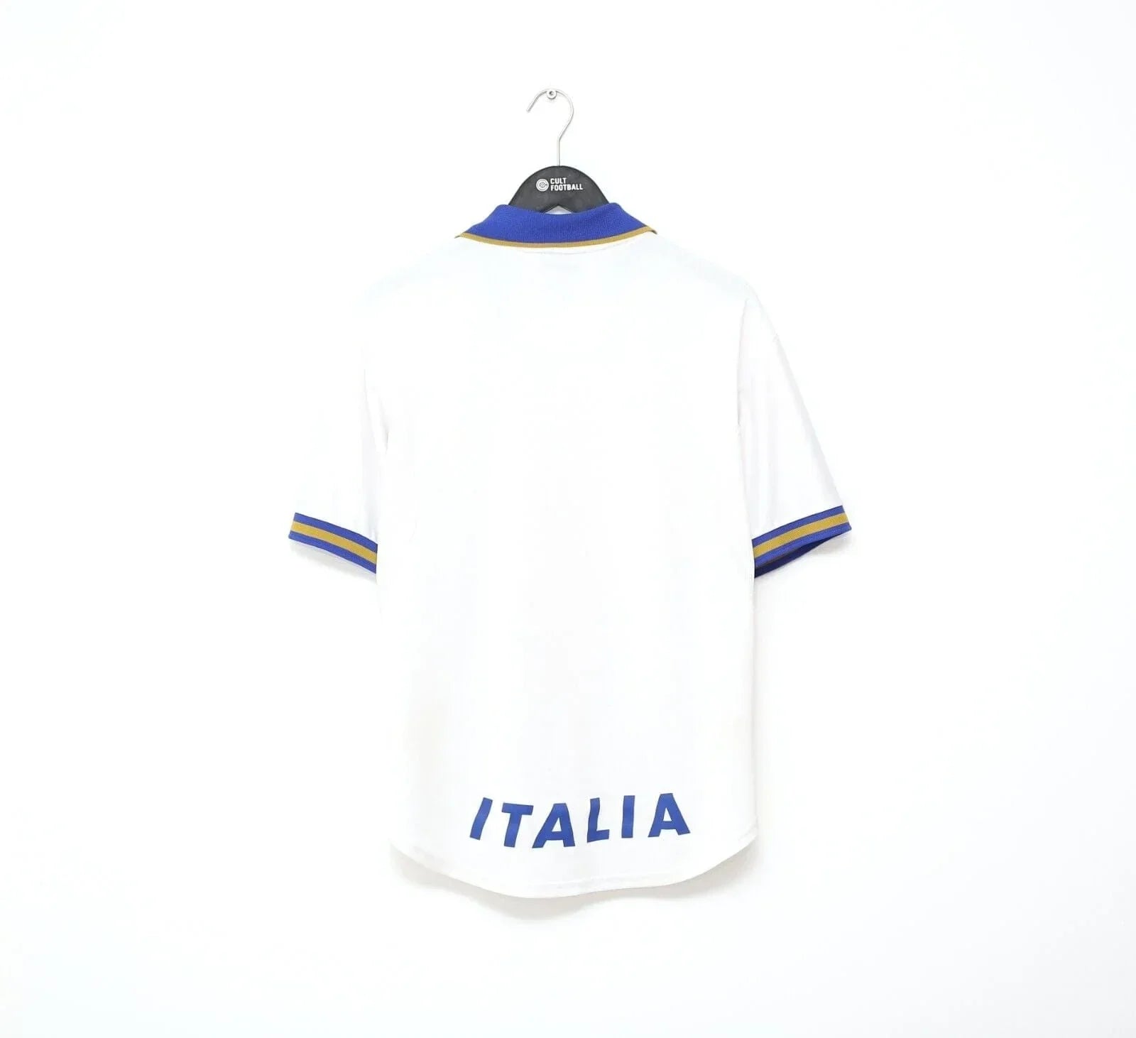 Embrace football history with the Italy 1997/1998 Away Jersey, a vintage collector's item. This iconic white jersey, featuring navy blue accents, an elegant embossed pattern, and a traditional polo collar, exudes classic style. Made from high-quality, breathable fabric, it offers comfort and a regular fit. Proudly display the FIGC badge and Diadora logo, symbolizing the era's esteemed partnership. Relive moments with legends like Roberto Baggio and Paolo Maldini, and add a timeless piece to your collection. Perfect for collectors and football enthusiasts alike.