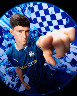 The Puma OM 2024-2025 Away Football Shirt features two shades of turquoise blue, inspired by the Mediterranean Sea, with golden logos representing the sand and beach. Made from high-quality, breathable polyester with moisture-wicking technology, it offers both style and performance. Available in sizes S to XXL, it's perfect for showcasing your Olympique de Marseille pride.