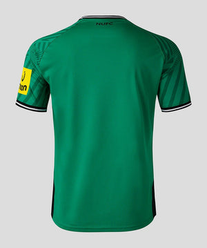 The Newcastle United 23/24 Away rep Kit features a striking design that pays homage to the club's rich history while embracing a modern aesthetic. The primary color of the kit is the iconic black and white stripes, symbolizing the strong identity and tradition of the team. The shirt is crafted with high-quality materials, providing optimal comfort and breathability for players and fans alike. The kit showcases a stylish V-neck collar and is adorned with subtle details, such as club crests and sponsor logos, tastefully integrated into the design. With its classic yet contemporary look, the Newcastle United 23/24 Home Kit is sure to inspire and unite supporters as they cheer on their beloved team.