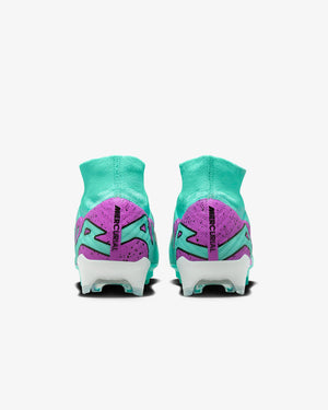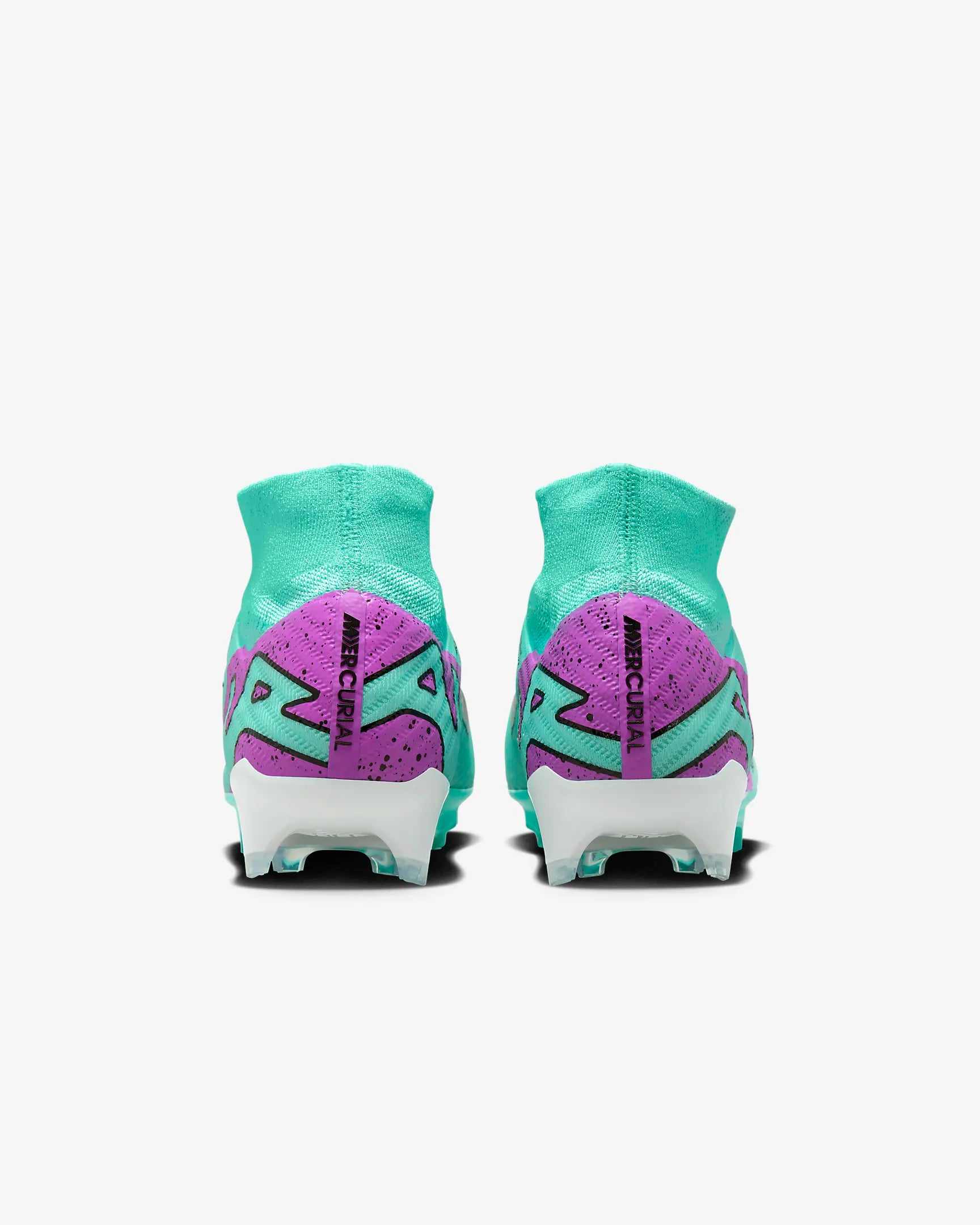 Introducing the Superfly 9 Elite Mercurial, a fusion of innovation and style. Featuring a striking Hyper Turquoise base with sleek Black accents, complemented by vibrant pops of White and Fuchsia Dream. Crafted for elite performance, its cutting-edge design offers unmatched agility, speed, and precision on the field.