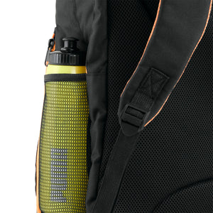 Functional backpack with a zipped pocket on the front to carry a padel racket.