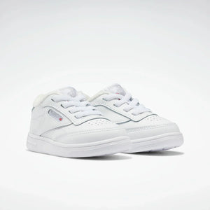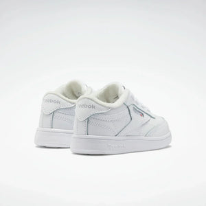 Baby's first pair of Reebok's. These tiny Club C shoes are a classic sneaker style for toddlers who are ready to roam. The soft leather upper and flexible outsold offers comfort and support for each stride. Stretch laces ensure low-stress owns and offs.