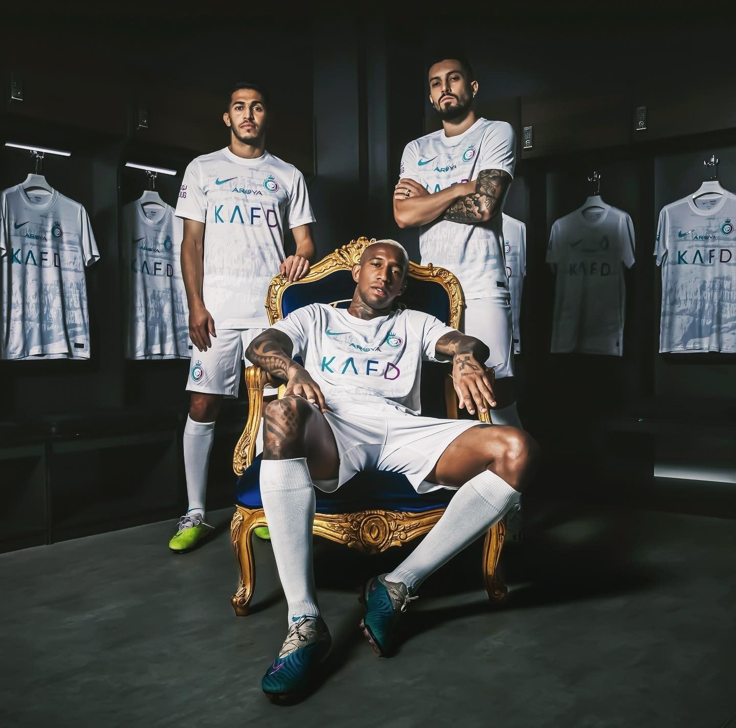The Nike Al-Nassr 2023-24 limited-edition third football shirt is predominantly white with the standout feature being the iridescent logos that appear in shades of turquoise and purple. The kit is inspired by Tuwaiq Mountain. Jabal Tuwaiq (Arabic: جَبَل طُوَيْق, Tuwaiq Mountain) is a narrow escarpment that cuts through the plateau of Najd in central Arabia, running approximately 800 km (500 mi) from the southern border of Al-Qasim in the north, to the northern edge of the Rub' al Khali desert near Wadi ad-Dawasir in the south. It is 600 m (2,000 ft) high and also has a Middle Jurassic stratigraphic section.