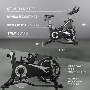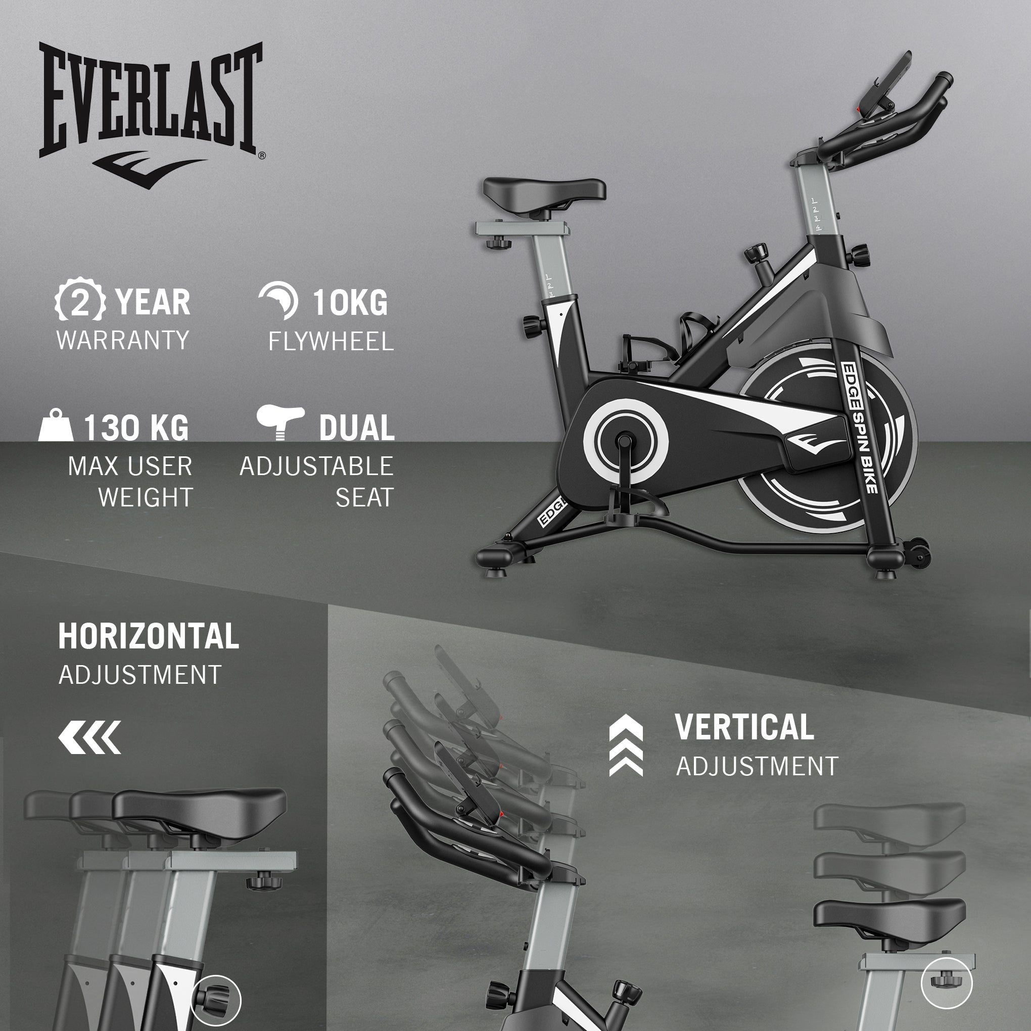 Contemporary in design, the Everlast Edge Spin Bike has a range of functions such as speed, time, distance and calories burnt, hand held pulse monitor, with an easy-to-read screen, The Everlast Edge Spin Bike helps to maximise fat burning while providing a fluid ride with its 10kg flywheel. Offering comfort with an adjustable seat, to help you to push harder and achieve your goals quicker! Maximum user weight of 130kgs.