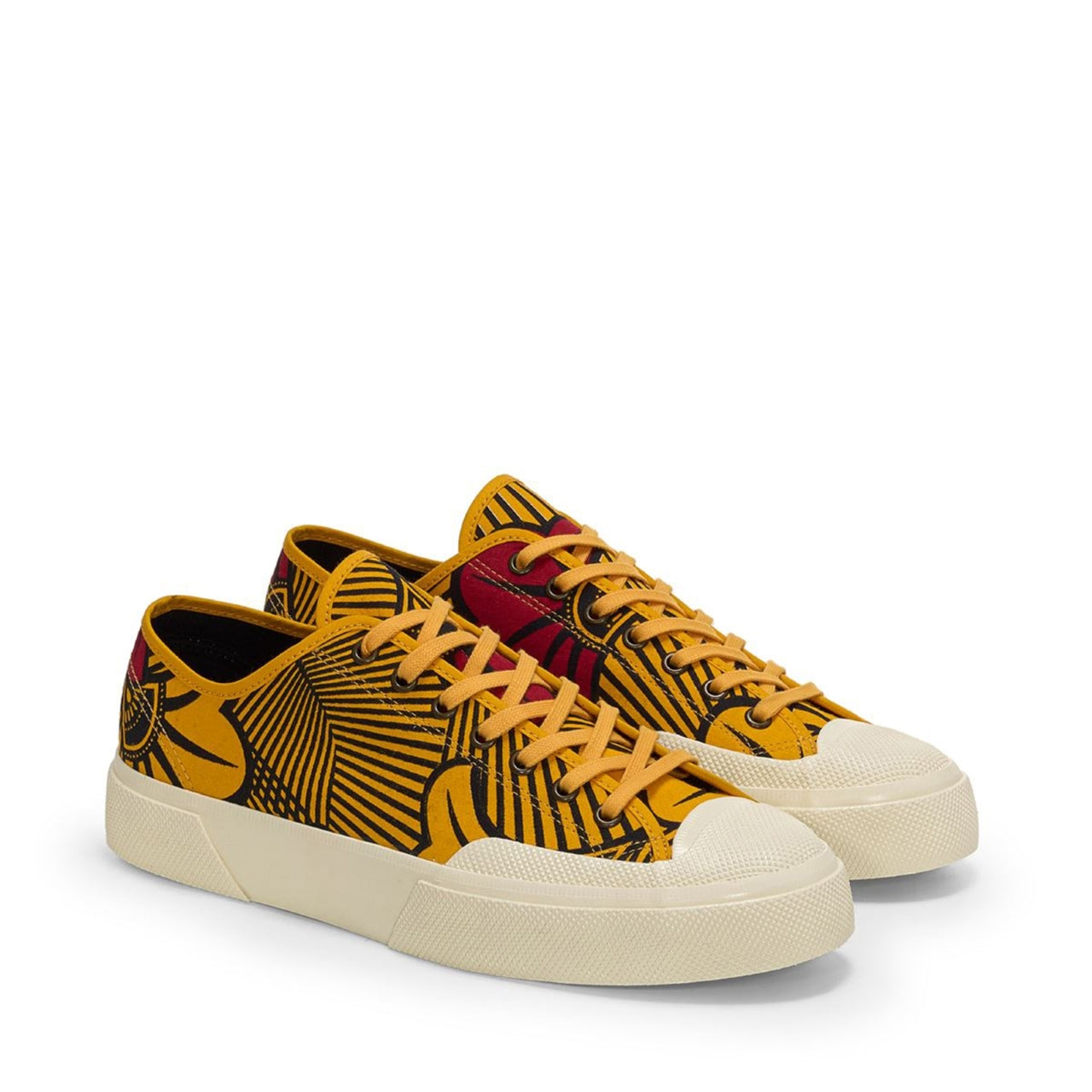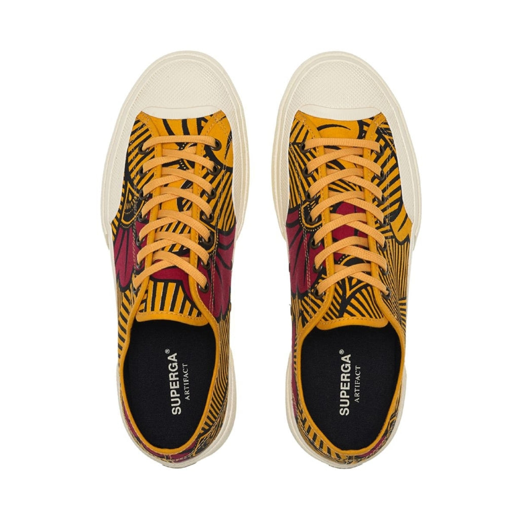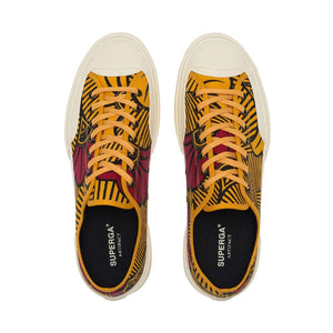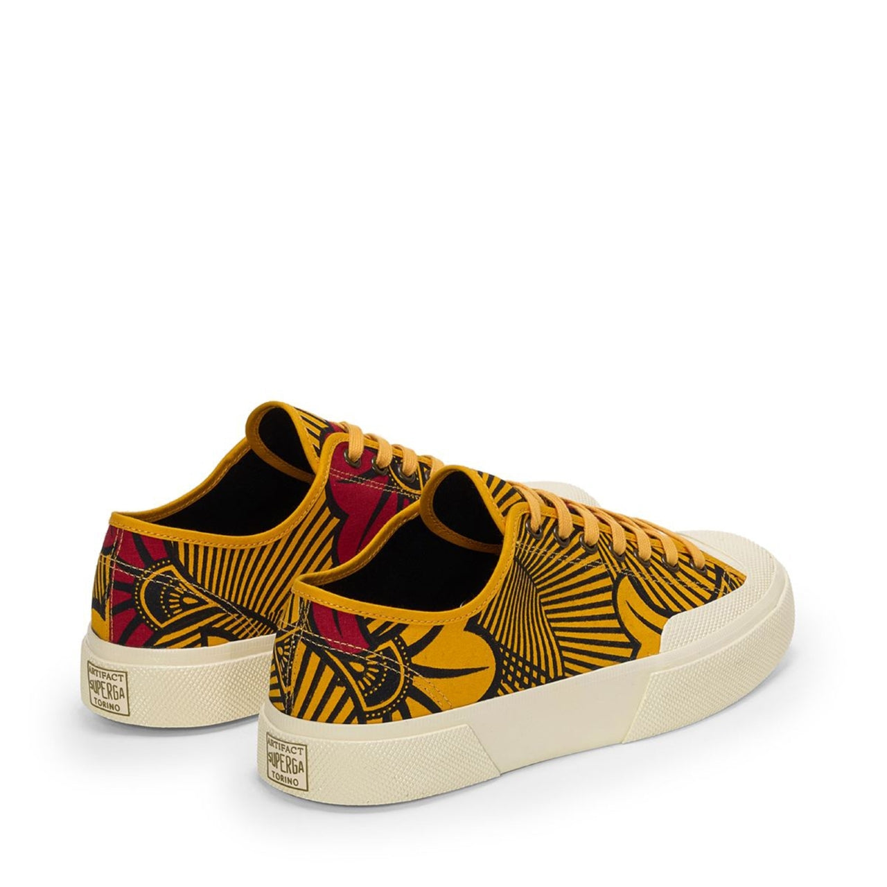 Works is the Superga Artifact sneaker crafted from printed cotton with  original Batik fantasy: the workwear-inspired ‘70s style, taken from the brand's  historical archives, adds personality to a clean and minimalist lace-up  silhouette with a cup sole, a slightly squared toe and reinforced lateral rubber  panels.